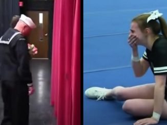 Cheerleader Can’t Stay On Her Feet When Navy Dad Walks Out From Behind The Curtain