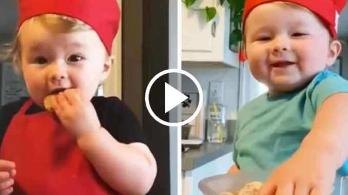 This baby chef is genuinely adorable. He’s dressed in a red chef hat with his blonde hair coming through. Kobe has a matching red apron too. His smile is infectious, and you can’t help but enjoy watching him.He’s talking baby talk while mixing, eating, stirring, and sampling different foods. Kobe loves watching and helping his parents cook and bake. He really gets into it, spreading the ingredients into each creation.