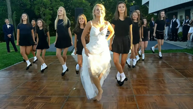 The bride joins in near the end at the perfect time and in sync to perform an Irish step dance with an orchestra. The bride joins a young girl who is apparently a member of the wedding party.